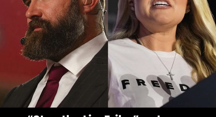 The former Eagles center, known for his unfiltered honesty and commitment to community, didn’t mince words when addressing the emotional speech delivered by Erika Kirk at the University of Mississippi (Ole Miss). While Erika Kirk stood before a massive crowd at a TPUSA event, attempting to rally the youth behind her late husband’s vision, Kelce publicly intervened with a powerful, two-word quote that instantly went viral: “Stop the Lie, Erika.”